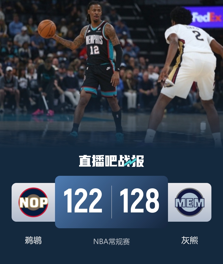 一開場,鵜鶘率先發(fā)力,普爾包攬球隊前8分,帶隊很快取得兩位數(shù)優(yōu)勢,小賈倫-杰克遜連投帶罰幫助灰熊打出攻擊波迅速迫近比分,次節(jié)普爾延續(xù)火力,錫安也連投帶罰幫助球隊擴大領先,小賈倫-杰克遜連續(xù)出現(xiàn)進攻犯規(guī),半場戰(zhàn)罷鵜鶘67-56領先灰熊。下半場,鵜鶘突然斷電,灰熊大舉反擊單節(jié)凈勝19分完成反超,末節(jié)鵜鶘及時回暖,多點開花打出9-0扳平比分,雙方爭奪陷入白熱化,小賈倫-杰克遜和蘭代爾均犯滿離場,關鍵時刻莫蘭特拋投得手,波普兩罰都有,錫安發(fā)球失誤,最終,灰熊128-122險勝鵜鶘。